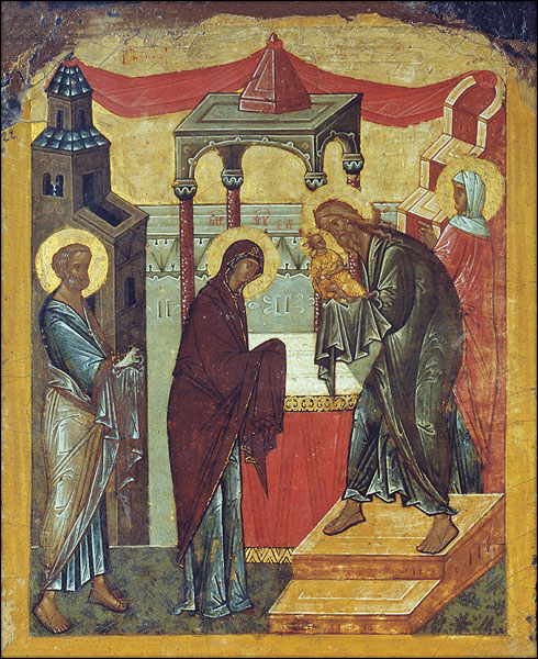 Чу Захарија Твоје дивне речи пред Богом, Пречиста, и видевши да љубљено чедо Своје на руке њега, свештеника Божијег, као на руке самога Бога полажеш, и да си два голубића донела, разнежи се у срцу и са вером и страхом Божијим прими Богомладенца и као законитом Творцу и Богу рече: